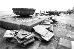 记者沿着滨海广场走了一遭,海水退去后满地狼藉,海带、海青菜、养殖泡沫、沙石等布满一地。在广场中间,十余根重达千斤的石柱被连根拔起,被海浪推出五六米远,横七竖八的躺在地上,地面上凸起的部分也被大浪打去了棱角,原本安装在地下的灯具也被冲了上来。