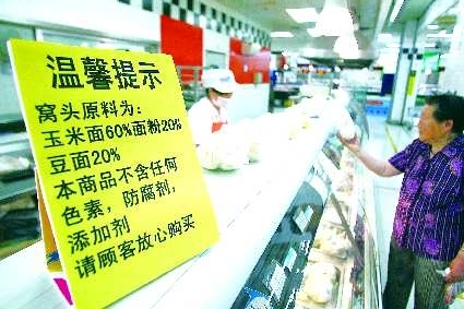 27日,在烟台南大街一家大型超市,一位市民正在购买面食。一旁的提示牌上清楚地写着面食的原料构成,让顾客消费得明明白白。