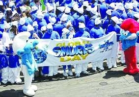 全球各地4891人在6月25日在全身抹上蓝色涂料,使自己成为比利时动画形象“蓝精灵”,以纪念全球“蓝精灵日”。纽约、伦敦、莫斯科等11城市的人们以这样的形象聚集一起,以打破“蓝精灵”同时集会的吉尼斯世界纪录。