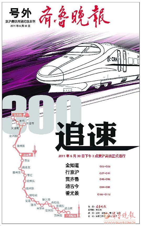 京沪高铁开通号外《追速》纪念金刊采用小版全彩杂志化印刷,共精心印制10万份,30日,在我省高铁沿线城市和高铁车站与读者见面。同时,金刊将登上京沪高铁G1首发列车,与京沪高铁的第一批乘客分享高铁带来的速度与激情。