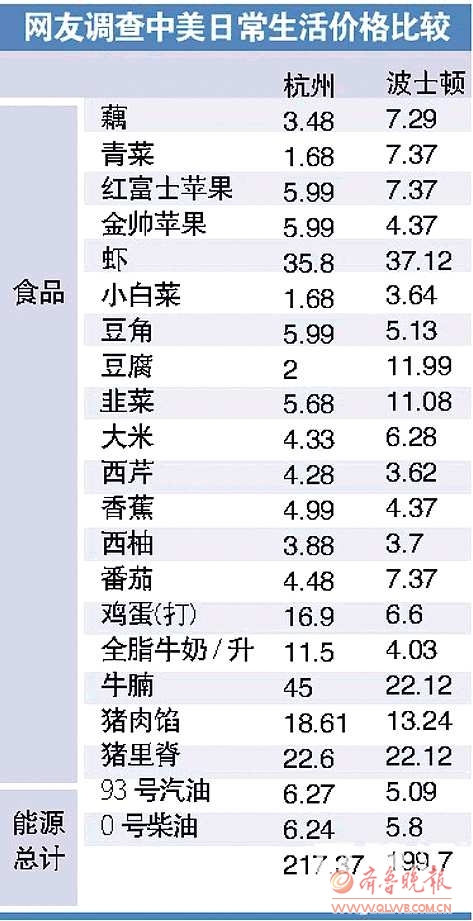 这个中美物价对比是去年12月,一位名叫王佩的杭州网友与她生活在美国波士顿的朋友联手做的一次中美实地物价调查。调查发现,在21种商品的价格(人民币)中,杭州有12种商品贵过了波士顿。