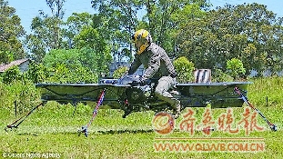澳大利亚男子克里斯托弗·马洛伊研制出世界上首辆“飞行摩托”,目前正处于低空飞行测试阶段。理论上,这种飞行器可在3000多米高度以时速278千米行驶。