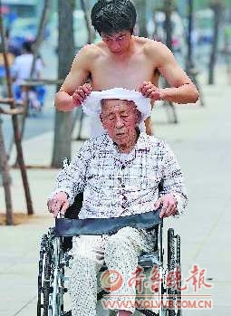 29日中午,明湖路上,一名年轻人推着轮椅在赶路。当天,济南天气闷热,为使老人免受暴晒之苦,小伙脱下自己的T恤,给老人做了一个简易遮阳帽。夏日午后,这分爱意让人感受到一丝清凉。 本报记者 邱志强 摄