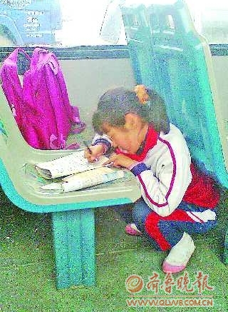 自述:放学了,女孩在公交车上忙着写作业。点评:不急着交,急着写。