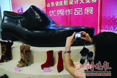 28日,在国际会展中心青岛国际皮革、鞋机、鞋材展上,一只长2.86米,宽0.98米的巨型大皮鞋吸引了一位参观者的眼球。据介绍,这只大皮鞋是由8名工人用时3个月设计制作完成。