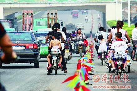 6月29日,由于天衢路铁路桥非机动车道进行施工,工作人员在机动车道上临时开辟通道供行人通行,但不少市民为图方便将车骑进快车道,在车辆中穿行很是危险。 本报记者 马志勇 摄