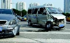 本报6月29日讯(记者 王琳)29日下午,在北宫街与北海路转盘处,一辆面包车与一辆轿车相撞,两车“伤情”都比较严重,幸好车上人员均无大碍。