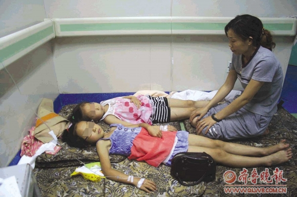 29日,记者在泰安市中心医院小儿内科病房见到了正在打点滴的小孟和小盛,两个小女孩躺着还不时向家长说肚子痛。小盛的妈妈刘女士说,28日晚上她带着9岁的女儿和亲戚的8岁女儿到卜蜂莲花超市选购蔬菜和牛奶,包括5小包装的君乐宝沙棘酸牛奶。结账后,两个孩子说要喝牛奶,但拆开后刘女士发现其中一包有涨袋现象,于是到服务台咨询详细情况。到咨询台后,刘女士说明了牛奶涨袋的事情,但此时发现她的女儿已经将其中一包喝完,而小孟也喝一半了。“5分钟左右,两个女孩都说肚子痛,考虑到其他袋装牛奶也有问题,于是把牛奶全部退掉了。随后,孩子就被送往医院看病。”刘女士说。