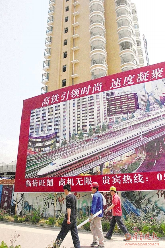 除了高铁新区回迁小区和泰安市保障性安居工程的几十栋楼房以外,剩下的闲置土地基本上都被其他房地产公司拍了下来。记者在广场看到,广场西边的两大块地已经被巨大的广告牌围了起来,牌子上的广告语都将“高铁”作为关键词。其中一句“迎接高铁商住新时代”,极大地吸引了过往行人的眼球,同时也把高铁与泰城人民的“商”和“住”紧密地联系了起来,成为人们新的商业谈资。