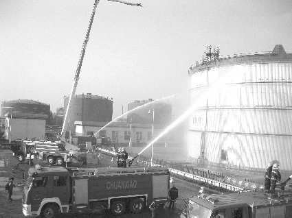 港航局调度室里接到情报,通知码头兼职消防员进行救援,并向鲁东应急救援中心报警。紧接着,鲁东应急救援中心一辆高喷车、一辆干粉消防车、两辆水罐消防车、一辆抢险救援车赶到现场,对V103罐实施灭火。四注强水注犹如长龙,扑向着火区域。环保局车辆、海港医院车辆也同时到达现场。