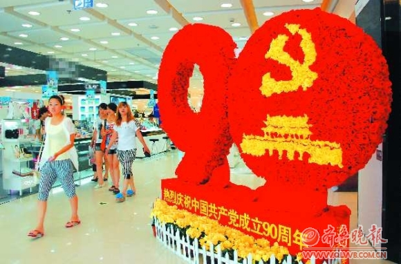 6月29日,滨州市一家大型商场内,市民从庆祝建党90周年的大型景观旁走过。为迎接“七一”的到来,市区从机关单位到居民小区、从街头到商场都洋溢着喜庆气氛。 本报见习记者 赵红云 摄影报道