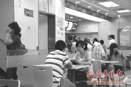 6月29日中午,气温达到33℃,黄四渤七银座商城附近的快餐店成了市民乘凉的好去处。