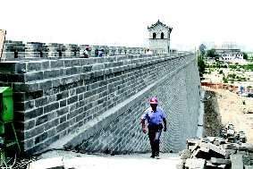 29日,古城区西城门两侧的马楼竣工,工人们正在紧张地修建主楼,再有一个月左右,西城门和北城门就可全部竣工。