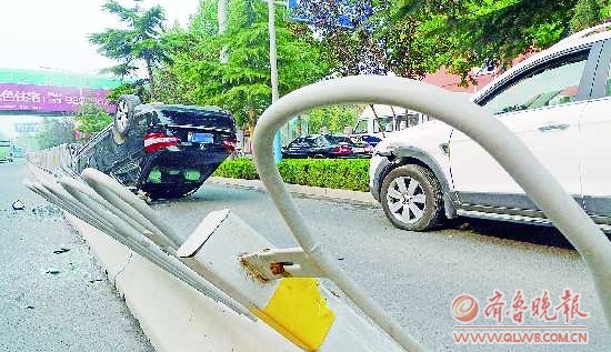 6月30日早上7点多,历山路与文化路交会处向北不远,一辆白色越野车在变道口向内车道变道时,一辆内车道直行的黑色轿车躲闪不及,撞上BRT护栏,向前滑行近十米后翻了车,而白色越野车开进了绿化带中。据交警介绍,黑色轿车车主轻微受伤,幸无大碍。之前,本报曾报道过历山路南端的变道口经常发生事故。 本报记者 王媛 陈文进 摄