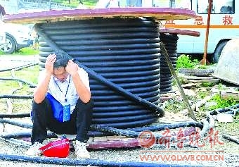 下图:4日,一名工作人员蹲在贵州平塘县牛棚煤矿透水事故井口外,井下被困23人。 新华社发