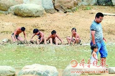 5日,孩子们在护城河边游泳池的人造沙滩上挖沙坑、垒房子,玩起游戏,让人感受到童年的快乐。 本报记者 邱志强 摄