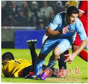 7月4日,乌拉圭队球员苏亚雷斯进球后庆祝。当日,美洲杯小组赛C组的比赛中,乌拉圭队以1比1战平秘鲁队。 新华社发