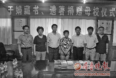 “如果我走了,把我带回家乡,把我的书就放在济宁一中。”5日下午,于娟藏书、遗著捐赠母校仪式在济宁一中举行,于娟的母亲将女儿的遗愿转达给母校领导,并将于娟生前的全部藏书和200册遗著捐赠给母校济宁一中。图为于娟母亲苏萍(右四)在捐赠仪式现场。