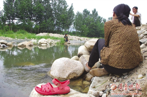 5日,岱岳区黄前镇村民徐西霞(前一)与妹妹徐西丽(左一)坐在下港河边哭泣。6月30日,徐西霞年仅11岁的女儿和年仅12岁的外甥在河里玩耍时,不慎滑进因乱挖奇石形成的深坑里,溺水身亡。