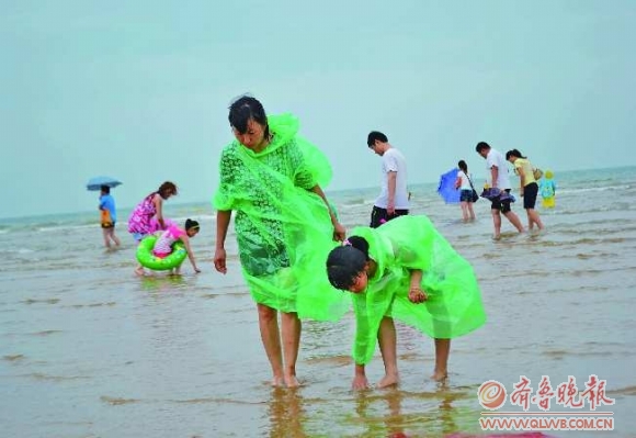 7月5日下午,一场阵雨突袭日照,在万平口沙滩上游玩的游客兴致却未降低,不少游客在雨中捡拾贝壳。据万平口风景区工作人员介绍,7月3日和7月5日的两场雨并未让当日海边游客大幅减少。 本报记者 张永斌 摄影报道