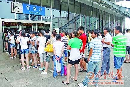 日照职业技术学院的学生小孙排在队伍的最后面,烈日晒得他大汗淋漓。他告诉记者,今天是日照职业技术学院学生放假的日子,大家都忙着买票回家,由于日照大学城没有售票点,就赶来火车站买票。