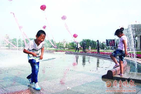 7月5日,新世纪广场上开放的喷泉成为孩子玩耍的乐园。前几日的降雨为市民带来了短暂的凉爽,天气转晴后气温持续走高,5日城区气温已达33℃。据气象部门预报,6日开始,东营将迎来连续两天的雷雨天气。 本报记者 段学虎 摄影报道