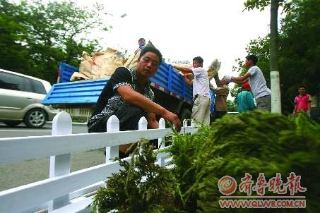5日,在香港西路上,工人正在安装路边绿化的护栏。据了解,为了扮靓青岛沿海一线,从5月起就开始对从栈桥至石老人海水浴场道路两侧绿化带进行美容,预计下周就能结束。