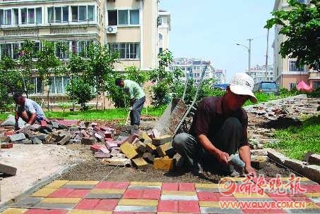 4日,在李沧区兴华苑居民小区,工作人员正在社区内整治路面,铺设新地砖。据了解,为改善居民生活环境,李沧区计划投资1000余万元对辖区内的11个街道、15个社区进行综合整治,整治活动将在15日前完成。 本报记者 张晓鹏 摄影报道