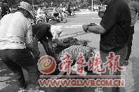 据悉,之前因为渤海七路修路整顿,为了防止地下水外溢到路面上,工作人员拿一些沙土袋把检查井填塞了。日前,渤海七路整顿完毕后,他们将沙土袋从井里打捞上来。图为工作人员正在把黄河四路渤海七路交界处的一检查井里的沙土袋打捞上来。