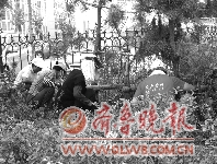 7月5日下午三点左右,烈日当空,正是一天中比较热的时候,几位工作人员戴着遮阳帽,在渤海九路路边的绿化带上清理杂草。