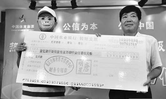 轰动彩市的体彩大乐透1.77亿大奖开出8天后,得主终于沉不住气了,7月5日上午现身重庆市体彩中心领走大奖,并捐款500万元。1.77亿元,扣除捐款和20%的个人所得税之后,还有近1.4亿。得主约好今天上午10点前来领奖,但10点半以后才出现。上午11点,工作人员全部就位后,1.77亿元大奖得主登场。11点05分,兑奖进入第一步———验票。两张巨奖彩票全部交给了重庆体彩中心技术人员。技术人员首先将彩票的条形码输入了数据库,电脑自动搜索核对后,生成单据,表明彩票中奖信息真实有效。之后,技术人员将单据通过传真传送到国家体彩中心数据处,国家体彩中心在第一时间给出了两张传真回复,再次确认中奖彩票信息。办理完手续,直到11点55才戴着孙悟空的面具在媒体面前现身。记者目测,大奖得主为一30多岁的男子,或许是故意,操着一口不标准的普通话。