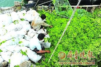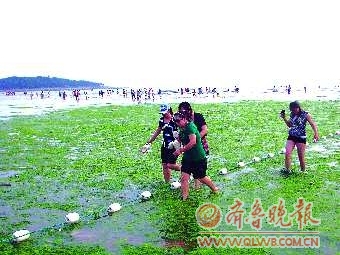 而在鲁迅公园附近海域,海面上一块块“绿地毯”不时被海水送上岸边,表现出一副抢滩的架势。据第一浴场管理处负责人唐闻洲介绍,由于下午游客聚集在岸边纳凉,不易组织大规模清理,准备明天一早等退潮后再集中清理浒苔。据介绍,未来几天如果持续南风,更大面积的浒苔可能会登陆海水浴场。