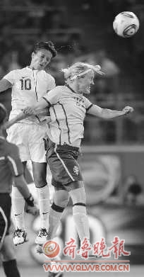 7月6日,美国队球员卡利·罗伊德(上)与瑞典队球员拼抢头球。当日,在德国沃尔夫斯堡进行的2011年德国女足世界杯C组第三轮比赛中,瑞典队以2比1战胜美国队,以小组头名出线。美国队以小组第二的身份出线。