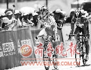 7月7日,乌克兰国家队的尤里(左一)在冲过终点后做出庆祝手势。当日,环湖赛进行了第六赛段祁连绕圈赛的比赛。在全长103公里的比赛中,来自乌克兰国家队的尤里获得赛段冠军。