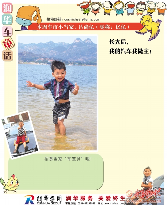 本栏目报名要求—————1、宝宝照片:儿童彩色单人照数张。2、宝宝档案:包括宝宝姓名、昵称、年龄、兴趣爱好等内容,字数在200字以内。3、宝宝与车的故事:以第一人称讲述宝宝的“汽车观”或汽车趣事,字数在200字以内。投稿邮箱:dushⅰchejⅰe@sⅰna.com(来稿请注明“车市小当家”)