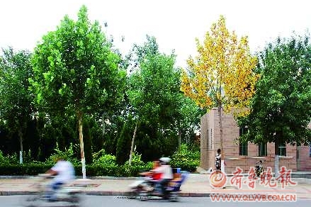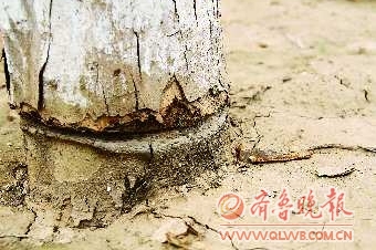 7月7日,德州天衢路一棵行道树的树叶枯黄,在周围郁郁葱葱的绿色中显得格外刺眼。而树下一圈深深的伤痕,可能就是“元凶”(小图)。