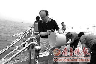 本报威海7月7日讯(记者 林丹丹) 7日上午,在威海湾内,渔业部门的工作人员将一尾尾增殖放流的鱼苗、虾苗投入海中。这是2011年黄海生物资源增殖放流活动,主要放流牙鲆、黑鲷、花鲈、中国对虾4个品种,共计放流65万个单位。