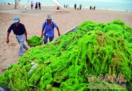 浒苔70多吨。图为7月7日,工作人员将清理出来的浒苔装车运走。