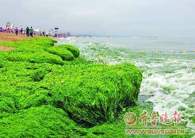 大面积的浒苔侵袭日照北沿海。7日,日照北沿海一些海滨景区沙滩上堆积的浒苔,影响了海滨旅游。由于海水中还有大片的浒苔,预计未来几天浒苔还将陆续大面积“登陆”。