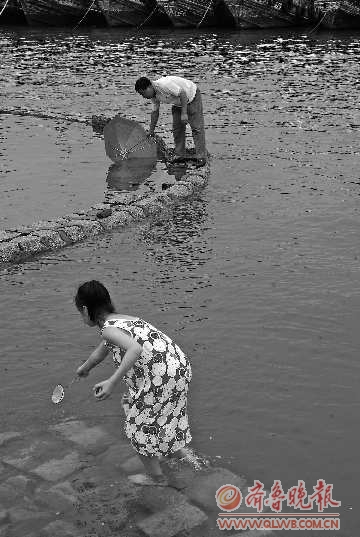 7月7日上午,天空下着小雨,在水运基地附近渔港内,不少市民不顾景区工作人员的劝阻,踩着岸边防护堤捕捉小鱼。据工作人员介绍,附近水域水很深,又是雨天,这样捕鱼非常危险。本报见习记者 张照朋 摄影报道