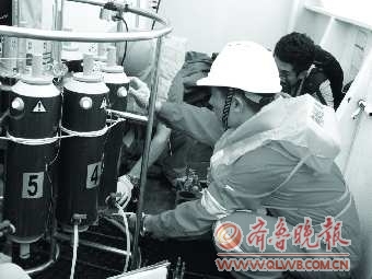 9点多,船舶到达胶州湾海域,考试人员开始分批次进行海水取样。记者看到取水样的仪器叫温盐深探测仪,共有10个采样桶,通过电脑设定,10个采样桶可以分别采到不同深度的海水,为了考试需要,此次10个桶全部采取来自海平面下5米处的海水。通过对这些海水监测分析,就可以测出海水的温度、盐度,判断水中溶解氧、水质化学需氧量和叶绿素含量。而根据这些内容就能判断出海水是否适合浒苔生长。“浒苔是边走边长,遇到合适的海水水质,生长速度非常惊人。”北海分局环卫处副处长于子江介绍说。