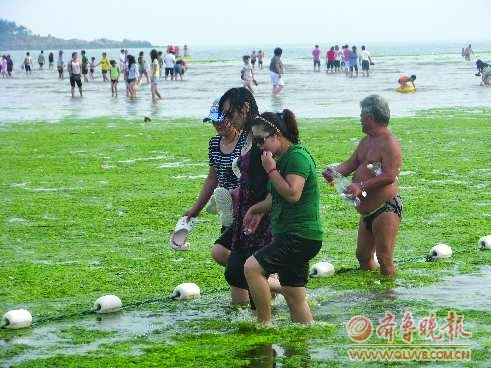 大面积浒苔不断逼近,7日,第一海水浴场今年首次发现大面积浒苔。根据国家海洋局北海预报中心7月6日的监测信息显示,浒苔已经入侵青岛6126平方公里的海域。目前,青岛启动绿潮应急二级响应。 本报记者 张杰 摄影报道