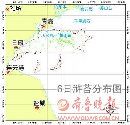 国家海洋局北海预报中心7月6日的监测信息显示,7月6日浒苔主要分布在119°18′E—122°00′E,34°35′N—36°11′N海域内,覆盖面积约410平方公里,分布面积约14700平方公里。其中青岛管辖海域绿潮覆盖面积约150平方公里,分布面积约6126平方公里。记者从青岛市海洋与渔业局了解到,由于目前抵达青岛的浒苔面积仍很有限,各浴场及各区市海洋与渔业局均可自行组织打捞浒苔,因此还没有大规模组织人员进行打捞,但在6月底渔业部门已经启动了Ⅳ级应急响应,并在重点区域对浒苔进行了打捞。