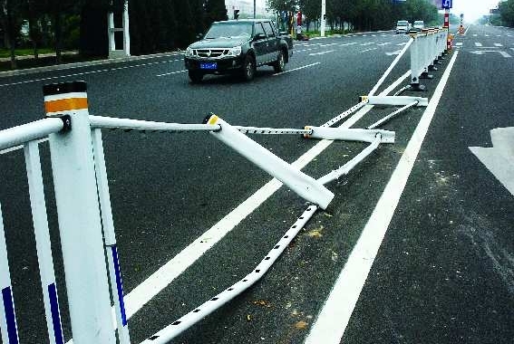 7月7日,在辽河市场北侧,黄河路上的四节护栏歪倒在地,路面上明显有一条汽车横穿过的痕迹,路边还有一段汽车保险杠。当日下午6时,记者联系到交通部门,对方表示正在协调维修护栏。