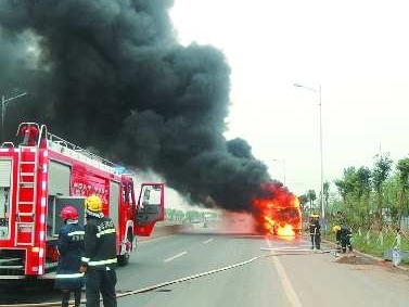 7月6日17时20分左右,在广饶县辛河路与陈官乡政府驻地交叉路口北侧,一辆豪华大巴车自燃。广饶县消防大队立即赶赴现场进行灭火,但大巴车已报废。据司机孙先生讲,当天没有载客,因为车辆油路方面有问题,检修路上车辆起了火。 本报首席记者 聂金刚 本报通讯员 李炳忠 李华滨 摄影报道