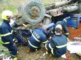 消防官兵到场后发现:一辆满载铁粉的半挂货车侧翻在路边的沟里面,驾驶室严重变形,并听到车内被困,群众的求救声,与被困人员对话得知车内的两名被困群众情绪还算稳定,救援人员在对话中安慰他们再坚持一会。根据现场情况,迅速展开救援并调集大吨位吊车,由于半挂车侧翻在沟内,沟内的土壤比较松软,破拆工具及起重气垫发挥不出其作用,救援人员利用铁锨对驾驶室下面的土及散落的铁粉进行清理,15分钟后,将其中一名被困者救出。这时另外一名被困在车内的群众情绪非常不稳定,在驾驶室内大喊大叫,消防官兵安慰其再坚持一会。约10分钟后吊车到达现场,到场后迅速展开起吊,将半挂货车吊起离开地面,救援人员迅速将被困在驾驶室内的另外一名群众救出,由在场的医护人员送往医院。
