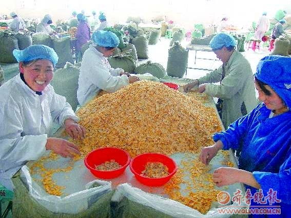 刘来增的蒜米加工车间里,几十名工人正在忙活着。吸蒜机处,“穿着衣服”的大蒜进去,“脱光”的蒜米出来,之后再被传输带送到消毒池里“洗澡”,然后就进真空包装袋了。装箱、封口、上冷藏车,不几天就运到国外去了。仅此一项,每年可为刘来增带来300多万元的经济收入。