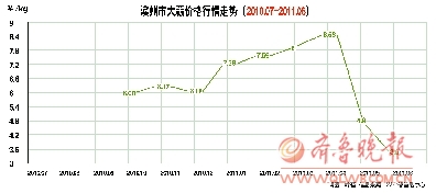 从山东省大蒜价格走势图来看,自去年7月至今年4月,大蒜批发价一直处于每斤6-12元的起伏区间内。但从今年4月至7月,大蒜批发价突然迅速下降,由最高每斤11.36元,跌至平均最低每斤1.65元。7月6日,记者从农业部信息中心了解到,滨州市批发市场大蒜的最低价达到每斤1.6元左右,为2010年至今的最低价。据滨州市物价局办公室王主任透露,大蒜价格有可能继续下跌,会给蒜农以重创。