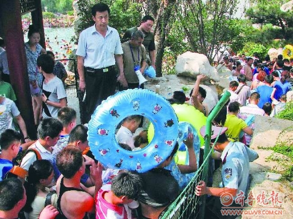 不游泳也要入场观看 9日上午11时许,泉水浴场不仅泳池里挤满戏水的市民,泳池岸边的台子上也有不少人。泉水浴场从“开张”至今火爆程度有增无减。为了尽力维持浴场的秩序,保证游泳环境,相关部门采取了不少措施,其中包括不游泳者不能进入浴场观看。