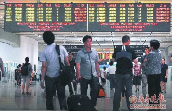 12日14时30分左右,京沪高铁济南西站的大屏幕上显示多趟高铁列车晚点的信息。 本报记者 徐延春 摄